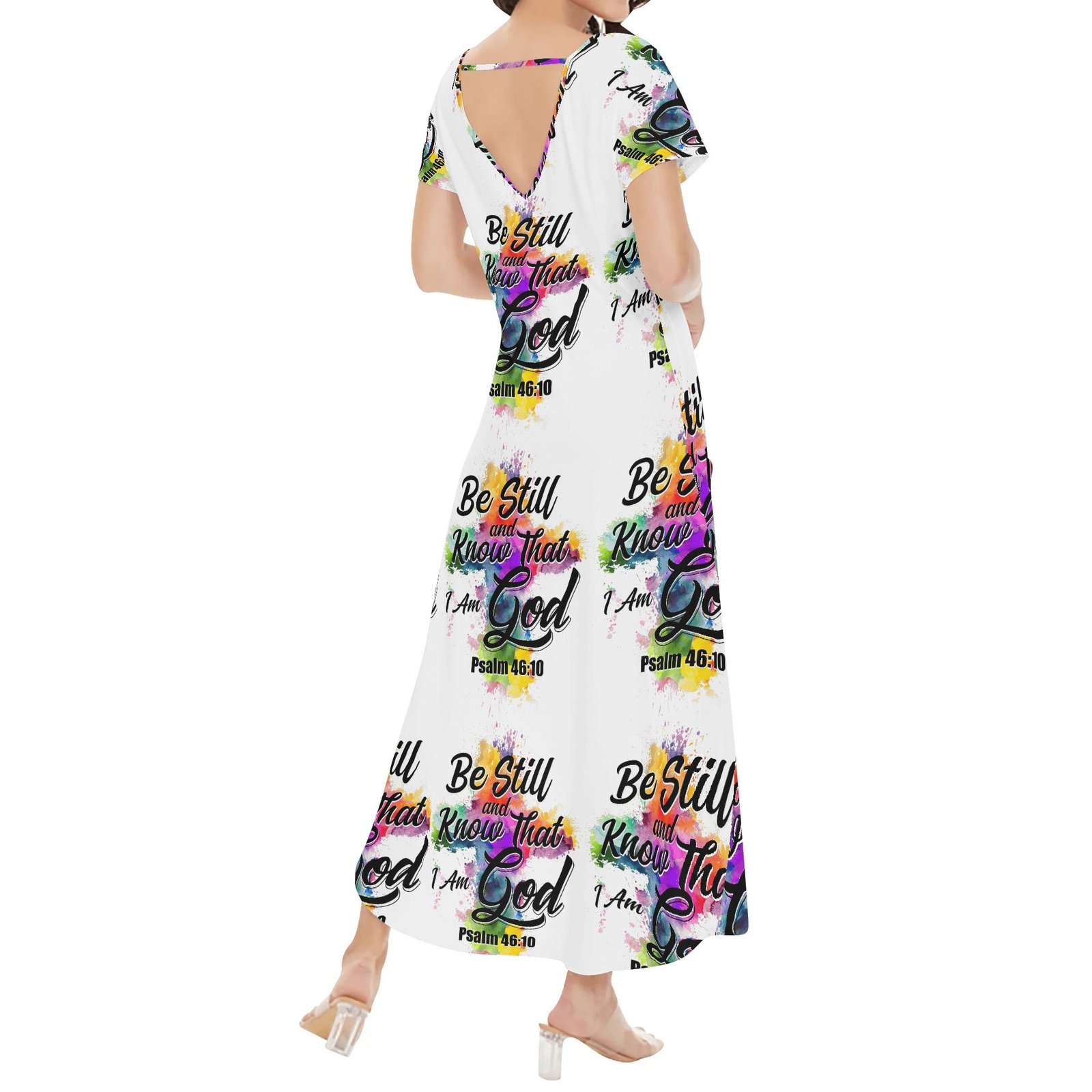 This stylish long dress is crafted from high-quality polyester with a soft, cotton-like feel (180gsm), offering comfort and elegance in every step. Its flattering V-neckline and gently draped silhouette create a graceful look that complements your figure while reflecting your faith. Whether you’re attending a worship service, celebrating a special occasion, or sharing your testimony through fashion, this dress is a beautiful canvas for Christian expression.